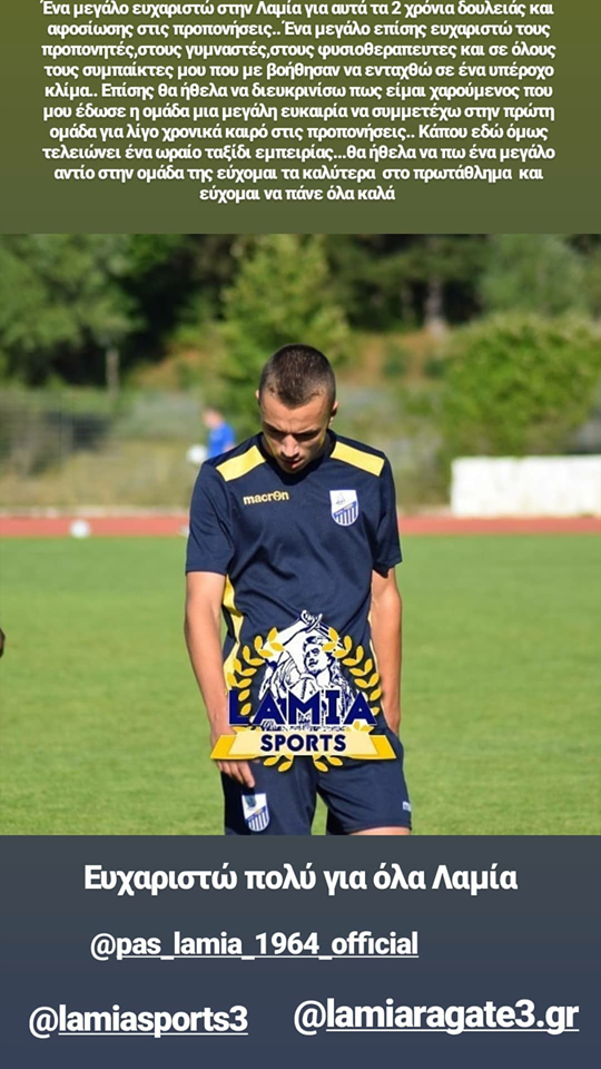 “Ένα μεγάλο ευχαριστώ στη Λαμία, για αυτά τα 2 χρόνια δουλειάς και αφοσίωσης στις προπονήσεις. Ένα μεγάλο επίσης ευχαριστώ στους προπονητές, στους γυμναστές, στους φυσιοθεραπευτές και σε όλους τους συμπαίκτες μου που με βοήθησαν να ενταχθώ σε ένα υπέροχο κλίμα. Επίσης θα ήθελα να διευκρινίσω πως είμαι χαρούμενος που μου έδωσε η ομάδα μια μεγάλη ευκαιρία, να συμμετέχω στη πρώτη ομάδα για λίγο χρονικά καιρό στις προπονήσεις. Κάπου εδώ όμως τελειώνει ένα ωραίο ταξίδι εμπειρίας. Θα ήθελα να πω ένα μεγάλο αντίο στην ομάδα. Της εύχομαι τα καλύτερα στο πρωτάθλημα και εύχομαι να πάνε όλα καλά…”
