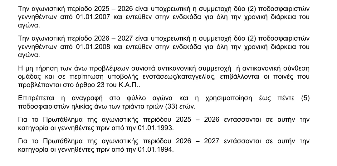 Σύμφωνα με το νέο πλαίσιο, την αγωνιστική περίοδο 2025–2026 καθίσταται υποχρεωτική η συμμετοχή δύο (2) ποδοσφαιριστών γεννηθέντων από 01.01.2007 και μετά, στην ενδεκάδα για ολόκληρη τη διάρκεια του αγώνα.