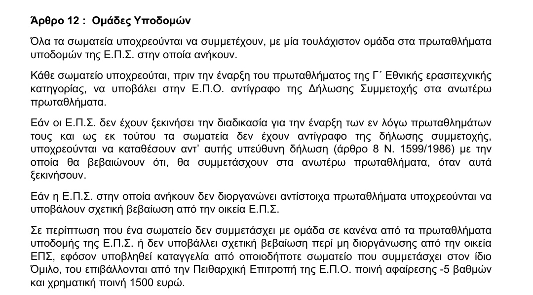 Αν η Ένωση στην οποία ανήκει το σωματείο δεν διοργανώνει καθόλου πρωταθλήματα υποδομής, απαιτείται η υποβολή σχετικής βεβαίωσης από την ίδια την Ε.Π.Σ., ώστε να καλυφθεί τυπικά η υποχρέωση.