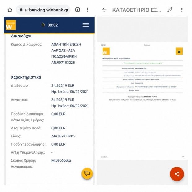 Το υπόλοιπο του τραπεζικού λογαριασμού της ΠΑΕ ΑΕΛ στην Τράπεζα Πειραιώς (αριστερά) και το αποδεικτικό εξόφλησης της ΕΠΟ (δεξιά), όπως τα έδωσε χθες το απόγευμα στη δημοσιότητα η ΠΑΕ ΑΕΛ μέσω της ιστοσελίδας της.